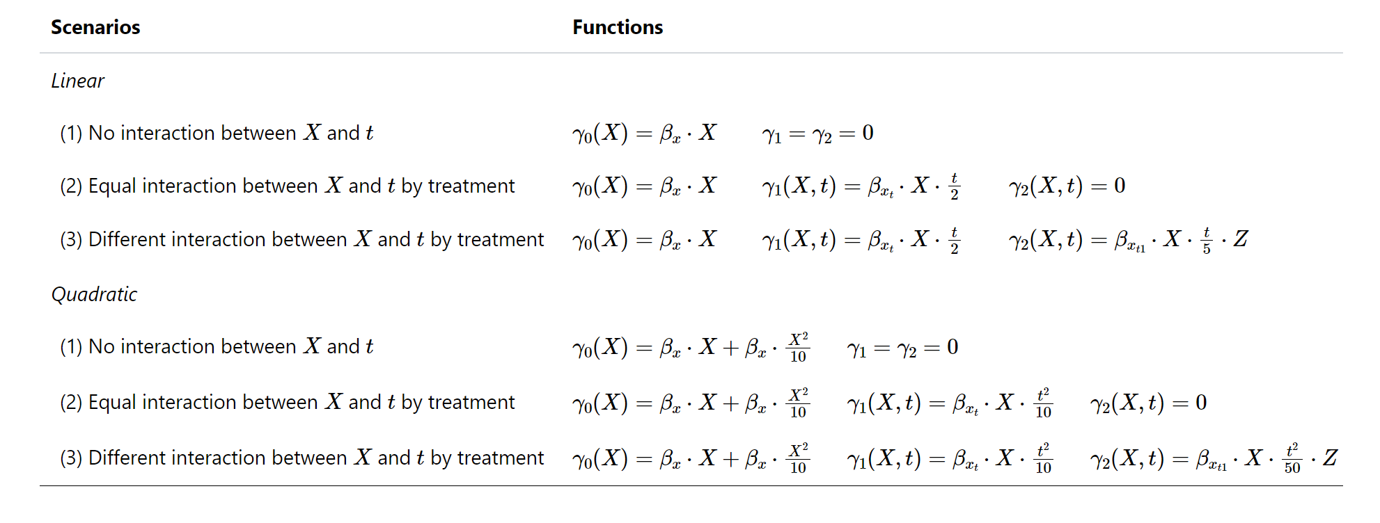 1) No effect or constant effect of X on Y over time: E[γ1(X,t)]=E[γ1(X)]